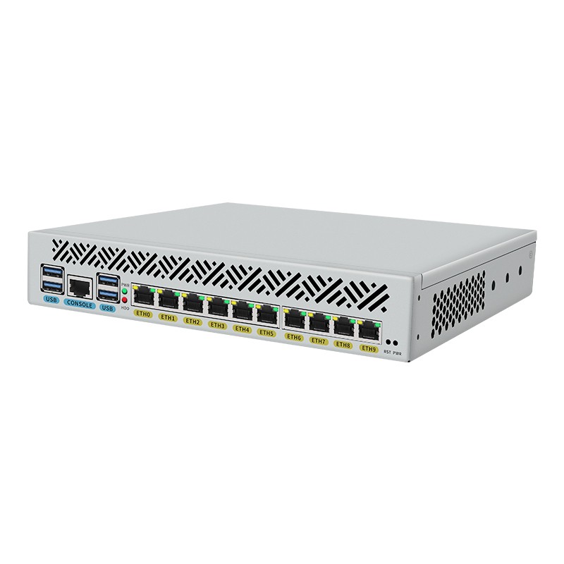 High-Density Networking: 10× RJ45 Ethernet ports for routing, firewalling, VLAN segmentation, and multi-WAN designs